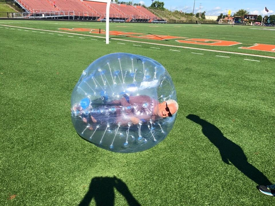 Every day is an adventure for Paul Thomas, 78, of Fenton. Once, while walking on the track at the local high school, Thomas spotted two young kids having fun on the field inside giant human hamster balls. Before long, he had borrowed one of the balls and was folded up inside.