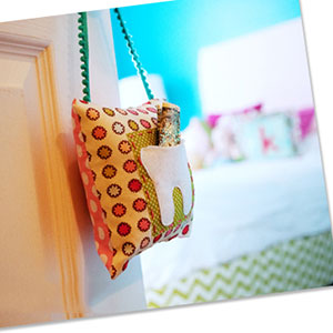 Worried about blowing your Tooth Fairy cover when leaving money under your child’s pillow? Consider making this pillow from How Does She. The small pillow can hang on your child’s door, making for an easy retrieval and drop-off process.