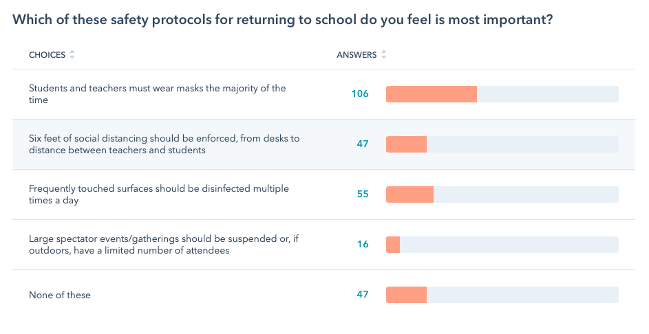 Mask wearing was the easy winner in this category. Over 38% of parents think students and teachers should wear them the majority of the time. The runner up at 20% say frequently touched surfaces should be disinfected multiple times a day.