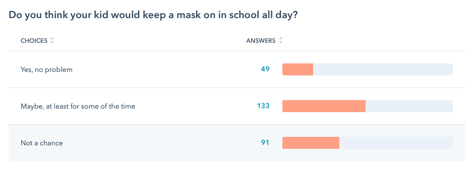 Yipes — this is a tough one. Nearly half of parents think their child might keep their mask, at least for some of the time. And a third say there’s no way that’s happening. Only 18% of parents feel pretty darn confident their child would mask up his or her entire time in the classroom.