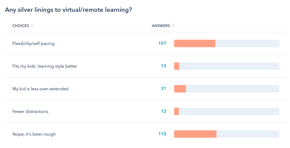 Nope and sorta — those are the top answers here. A full-on 39% of parents declared, “it’s been rough”; no sugar-coating here. Hot on their heels, though, were 38% of moms and dads who feel the flexibility/self-pacing has been a benefit.