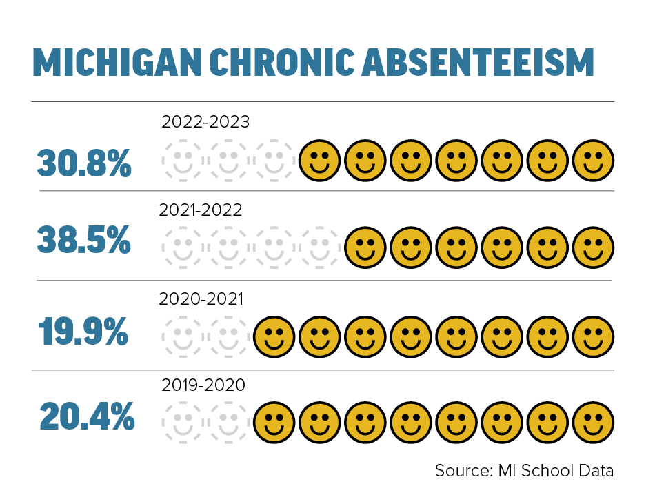 In the 2022-2023 school year, 30.8 percent of Michigan students were chronically absent, down from 38.5 percent the previous year. But pre-pandemic, that percentage stood at about 20 percent.