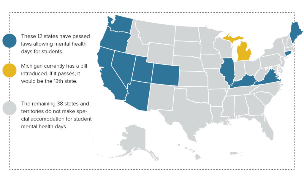 In January, State Senator Sarah Anthony introduced a bill allowing for mental health days in Michigan, but it hasn’t been signed into law. It was assigned to the Committee on Education in April. Michigan — which has one of the highest chronic absenteeism rates in the country — is one of a handful of states that also still penalizes parents for chronic absenteeism. Designed to reduce absenteeism, parents and students in Michigan can face court charges for being chronically absent.