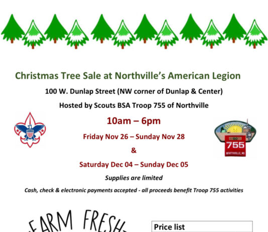 The scouts of Northville's Troop 755 will sell farm fresh Christmas trees again this year. Supplies are limited. Pre-order by emailing t755trees@gmail.com.