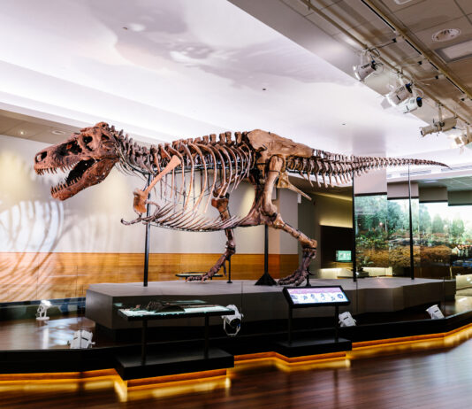 This traveling exhibit comes from the Field Museum in Chicago and features an exact cast of SUE’s skeleton, measuring in at 40 feet from snout to tail and 13 feet tall at the hip.