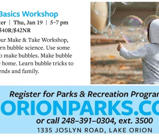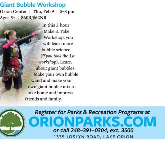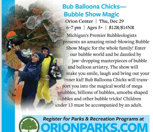 Ages 5 and up can enjoy a family-friendly bubble show at Orion Recreation Center. BubBalloonaChicks will transport you into the magical world of mega bubbles, billions of bubbles, amoeba shaped bubbles and other bubble tricks! Children under 13 must be accompanied by an adult.