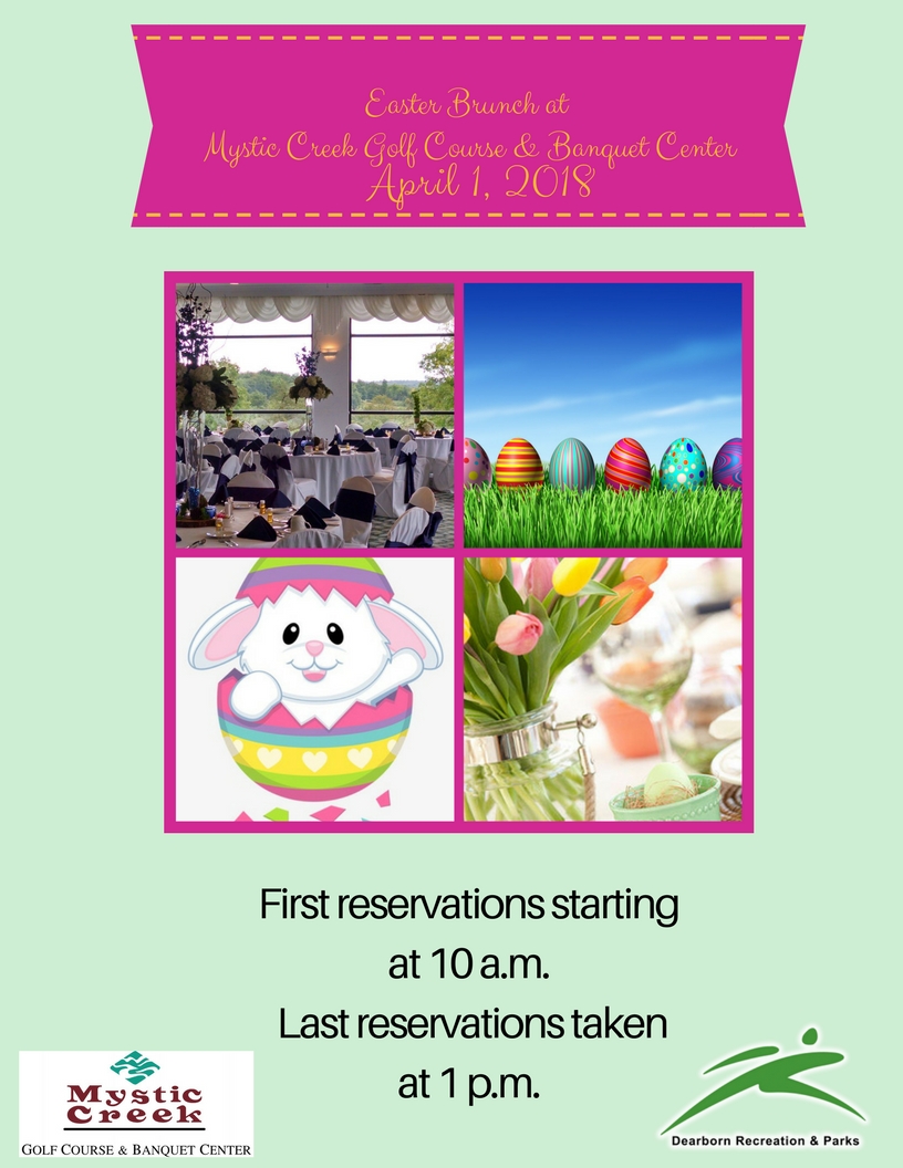 Don't feel like cooking on Easter this year? Book reservations for Easter Brunch at Mystic Creek. It features pictures with the Easter Bunny, a Buffet, Juice Bar, Coffee and Tea. Drink Specials and Cash Bar available!