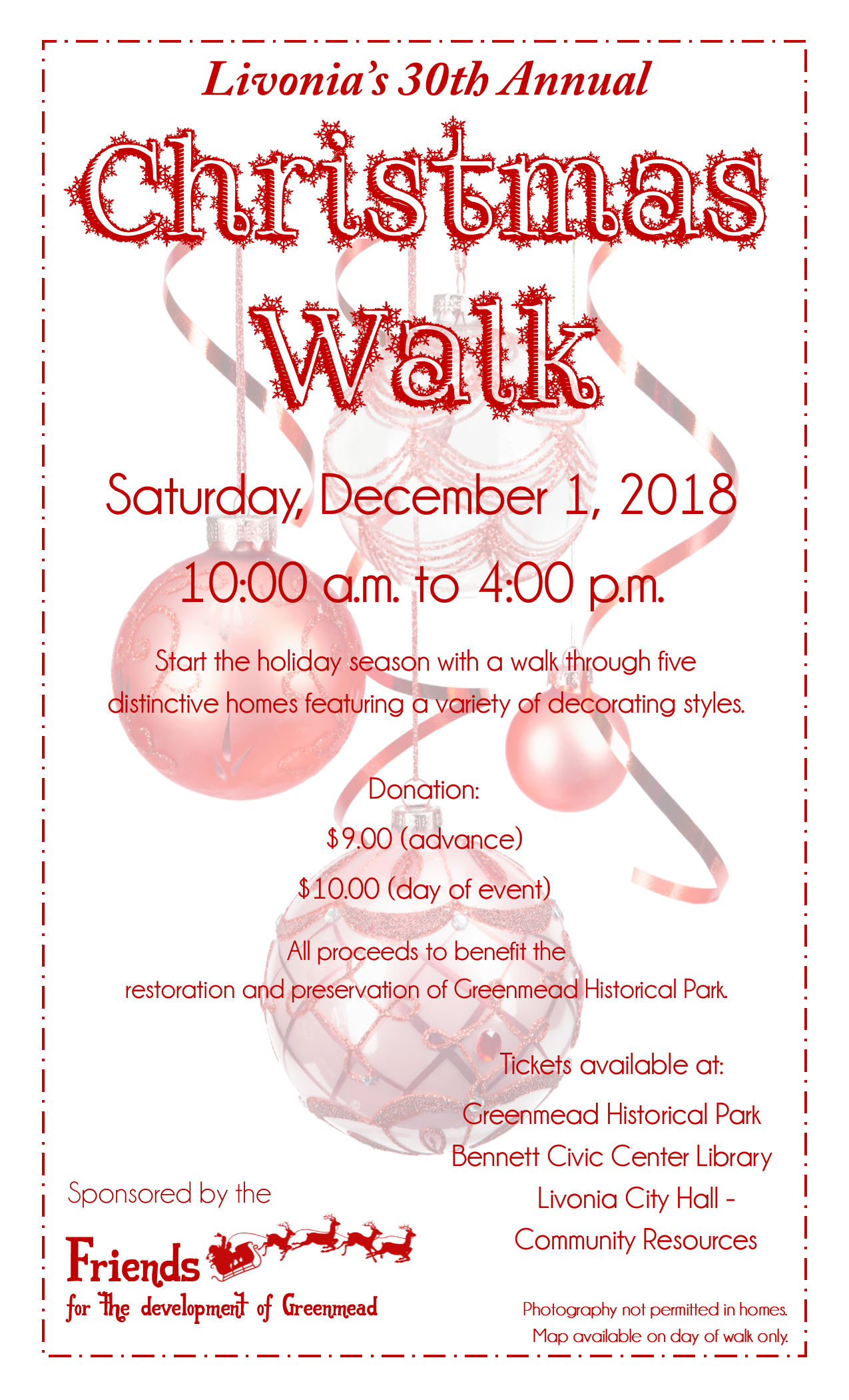 Tickets are $9 in advance, $10 day of the walk. Tickets will be available in advance at the Greenmead Office, Civic Center Library, and Livonia City Hall 5th Floor. Please be prepared to pay with cash or check.