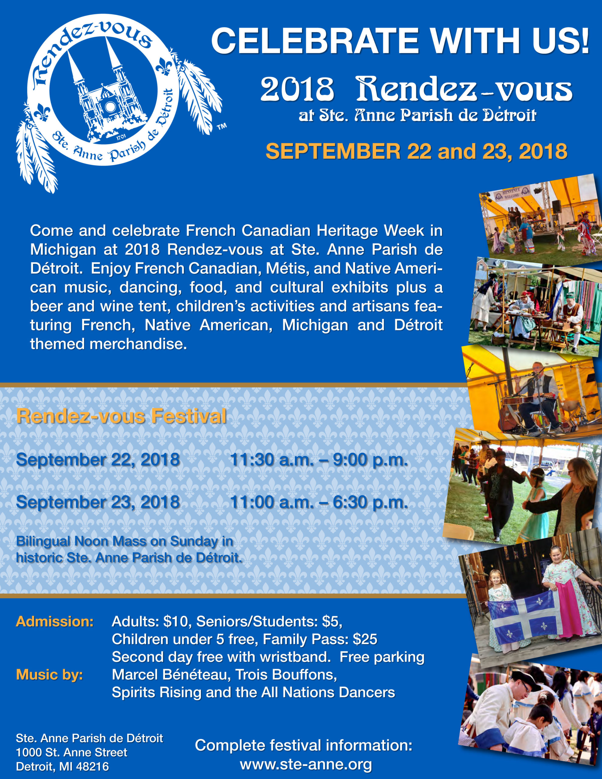 The Rendez-vous is a bilingual event, in French and English. Tours of the historic Ste. Anne de Détroit, a National Landmark, which was founded by the French in 1701 and is the second oldest ongoing parish in the United States, will also be held.