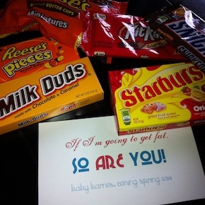 As baby grows, mommy grows, and why should mommy gain all the weight? Give dad sugar shock with a bag full of candy that shows he’s going to get his baby belly, too!