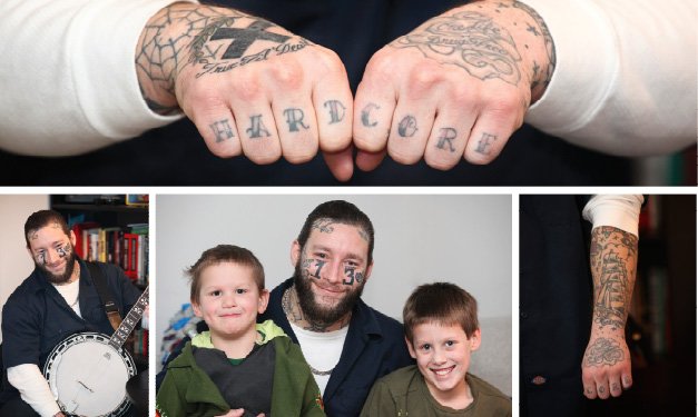 No doubt. Haze – who’s an artist at Eternal Tattoos in Livonia and singer of xTYRANTx (say “Tyrant”), a local hardcore band (think heavy punk) – is a doting dad to two adorable, impish blond boys. And, he estimates, 80 percent of his body is inked.