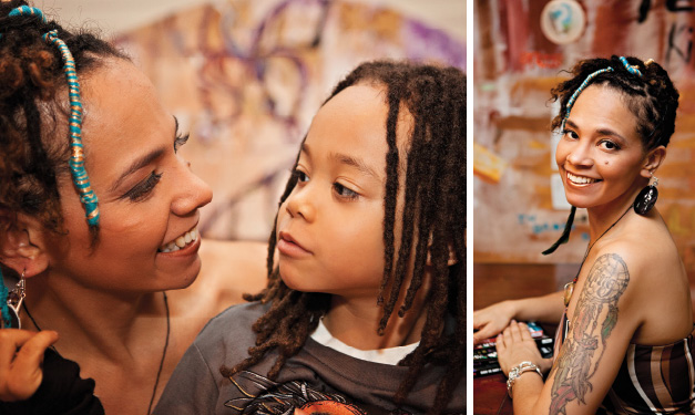 In their Corktown home – moore moved back in late ’07 – her kid’s art hangs on the wall next to her own. And while King’s more focused on skateboarding right now, mom makes sure he’s exposed to art in all forms. Books are plentiful, as are paint brushes and glue sticks.