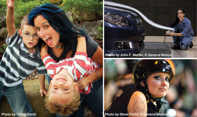 Her vibrant blue hair, for one, was inspired by that trademark GM blue, she says. Both her boys know about all types of cars because of mom’s involvement shaping them. Even her derby persona is auto-inspired, paying homage to her recently sold bright orange Camaro SS.