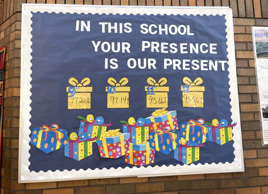 A poster hanging on a brick wall by the school entrance tracks the daily attendance rate of each grade. Students who miss two days or fewer in the class with the highest attendance each month get rewards like cookies, nachos, or a movie day.