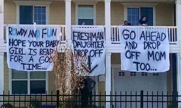 The signs, which were hand-painted on white bed sheets, read, “Rowdy and Fun! Hope your baby girl is ready for a good time,” “Freshman daughter drop off” and “Go ahead and drop off mom too,” greeted all passersby the frat’s off-campus house on 43rd Street.