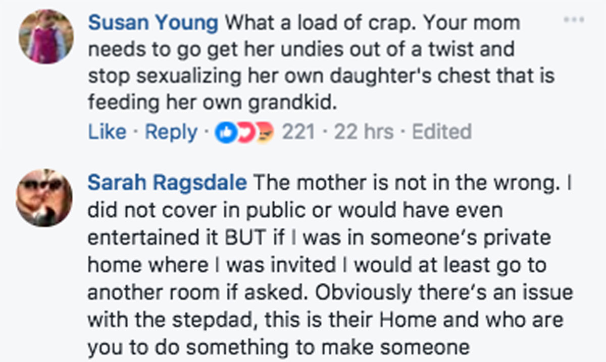 “So I started to get my kids ready to go and she said, ‘You’re really going to leave because you’re in MY house and I want you to cover up? I don’t care how you nurse in your own home, but at my house you need to cover up. No one wants to see that,'” the mom wrote on her Facebook post.