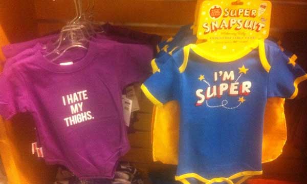 The onesie is made by Wry Baby, which is also sells onesies that say, “Love Me for My Leg Rolls” and “Silently Judging You.” Clearly, the company likes to manufacturer silly graphic onesies, but the thigh one is a bit much. Why start body issues from so young? I know it’s supposed to be a joke, but why even go there with little girls? As women, we deal with so many unrealistic expectations of the perfect body. There’s absolutely no reason to put that on our little girls.