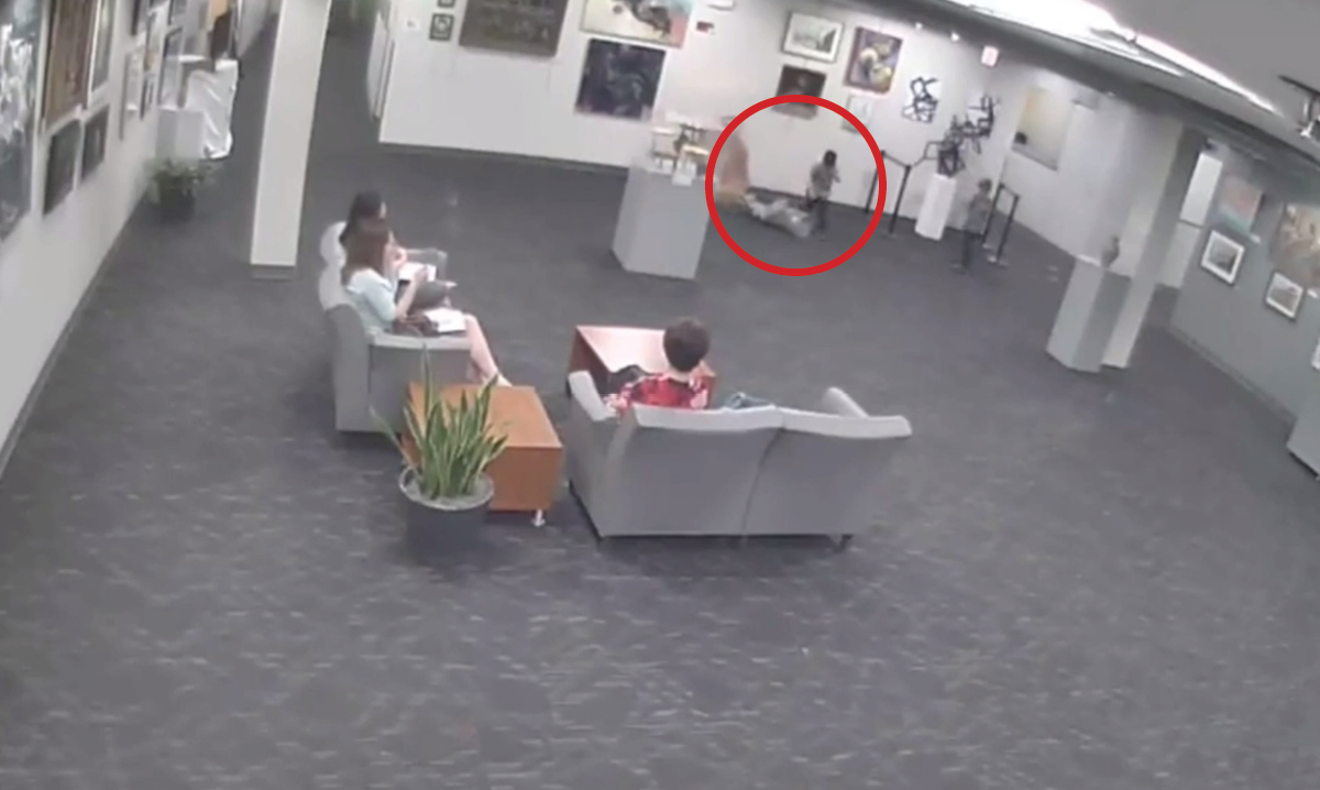 The third time, Goodman’s son pulls the statue to the ground and falls on it. There were three women sitting on a couch across the room who did not intervene until the statue was on the ground.