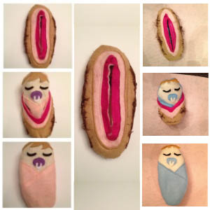 Yep, that's right. Beaver Baby describes exactly what you're thinking of. This faux vagina made of felt – and complete with pubic hair – can be turned inside out, transforming into a bundled baby girl or boy. It's "just like Mother Nature intended," One Classy Motha! writes.