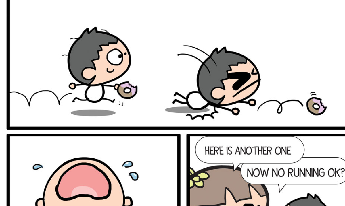 Parents will chortle heartily at the simple illustrated strips of mom asking for a kiss and then getting head-butted in the face, junior insisting that he didn’t poop when there’s a bright yellow mess coming out of his diaper and, of course, junior crying while mom is trying to use the toilet, among others.