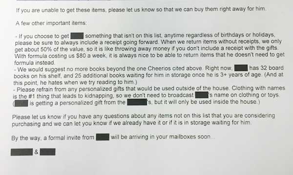 Other tidbits of demanding details are peppered throughout, like the note for invitees who decide to buy something not on the list (uh-oh!). “If you choose to get (baby) something that isn’t on the list, anytime regardless of birthdays or holidays, please be sure to always include a receipt going forward. When we return the items without receipts, we only get about 50% of the value, so it’s like throwing away money …”