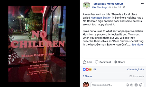 There are some places that kids really shouldn’t be. Strip clubs or dive bars, for example, are probably not the best places to tote junior to. A pizza joint, on the other hand, shouldn’t have an issue with pint-sized patrons – but one Tampa area restaurant, the Hampton Station, is definitely not doing the kid thing … at least not anymore.