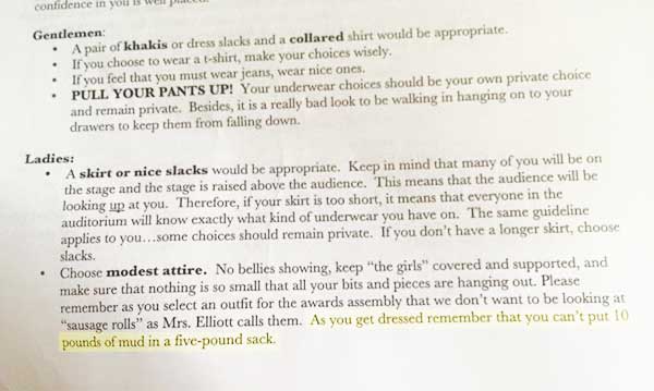 “Choose modest attire. No bellies showing, keep “the girls” covered and supported, and make sure that nothing is so small that all your bits and pieces are hanging out. Please remember as you select an outfit for the awards assembly that we don’t want to be looking at ‘sausage rolls’ as Mrs. Elliott calls them. As you get dressed remember that you can’t put 10 pounds of mud in a five-pound sack.”