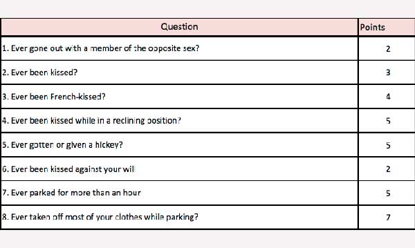 You get a number amount for each question that you answer “yes” to and at the end you add up those numbers to get your score, which ranges from “A nerd – just where you should be at your age” to “indecent.”