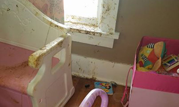 After cleaning up Alessandra’s room, Hill said the damage totaled “two rolls of paper towels, five stolen gym towels, a bottle of Pine Sol, a bottle of bleach, a big bag of crap-covered toys – and, two-and-a-half hours later, her room still smells like a dumpster fire.”