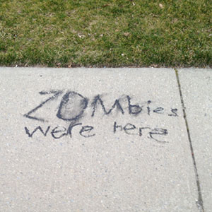Sure, it was probably a teen or older kid that did this one, but we couldn’t resist popping it in here. If zombies are walking among us around here, thanks for the message but where did they go? This is kind of important information to survive the apparently impending apocalypse. Step it up, kids.
