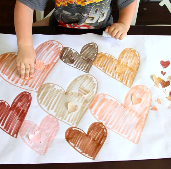This simple activity introduces race with kids as they match skin-toned mini hearts with big ones using multicultural markers. Kids can color in the hearts or you can color them in advance. Don’t hesitate to mix and match the colored hearts to show that we all belong together.