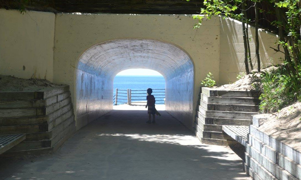 Tunnel Park is named for the concrete tunnel that cuts through a sand dune and provides access to a Lake Michigan beach with opportunities to swim and picnic. A children’s playground complete with a dune climb and stairway to an overlook make this a fun family beach stop.