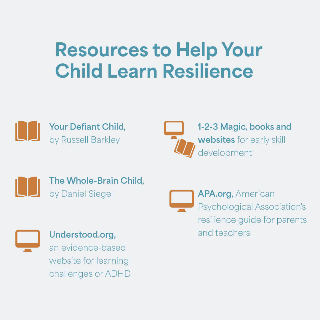 Finally, remember that your child will also learn resiliency skills from a community of influential adults, teachers and caregivers, says Dr. Abrego. Surround yourself with support and offer support to friends and family, too. “When you build relationships and become a supportive caregiver, you are helping children in the long run.”