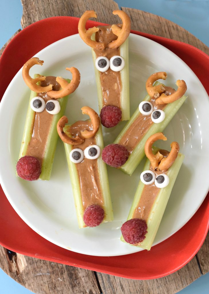 Snacks just don’t come any cuter. A holiday take on the traditional “ants on a log,” this healthful snack adds pretzel antlers and fresh raspberry noses to crisp celery stalks filled with peanut butter. They’re fun to assemble and so easy to make, even wee cooks can put them together. According to Cara at Fork and Beans, if your child has nut allergies, these are just as delicious with your favorite seed butter.