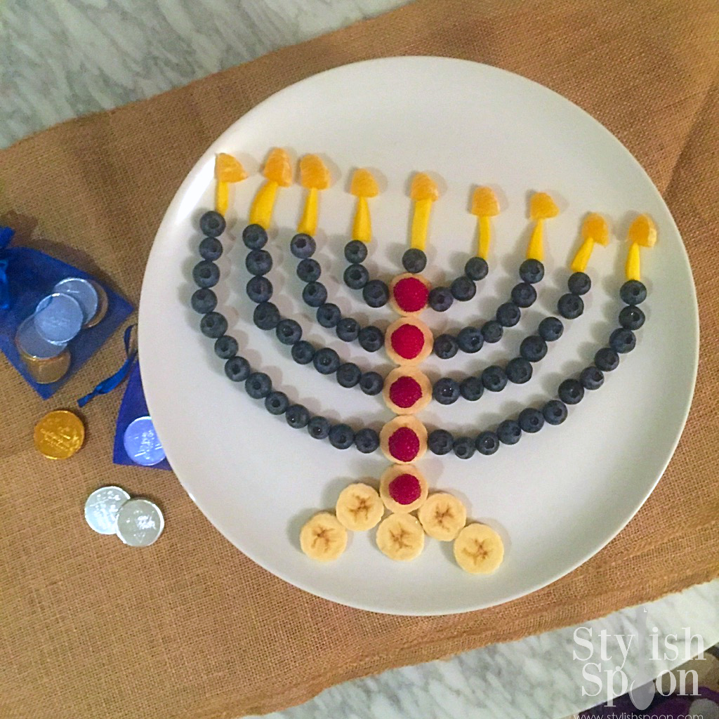 This deliciously colorful platter makes fruit even more fun to eat. Ilana Eck at Stylish Spoon says her fruit menorah took just minutes to assemble – including the time it took to prep the fruit – and disappeared shortly after she set it down between her girls. Banana slices and raspberries form the base, and blueberry “arms” hold up mango and clementine “candles” representing the lamps that burned for eight days on one day’s worth of oil.