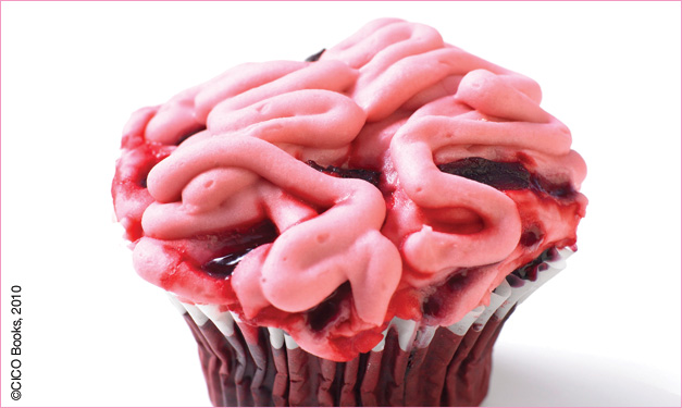 It’s the perfect base for her “Blood Stained Brains” cupcake recipe – which also features pink-tinted butter cream frosting piped on top in a zigzag, brain-like manner. She fills in the cracks a gory “cherry sauce” sure to be a fun gross-out! You can find the recipes for the frosting and sauce in the October 2010 Metro Parent print issue.