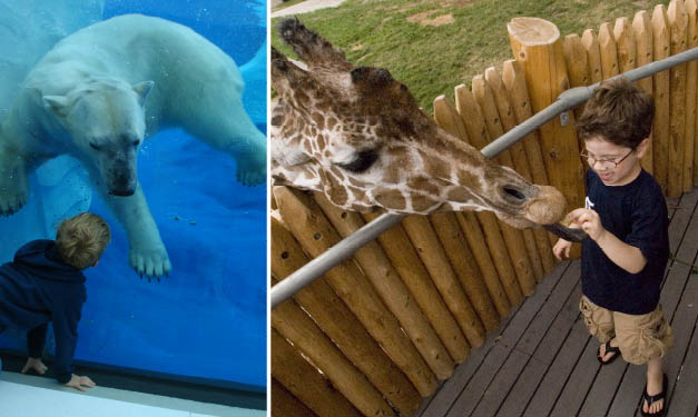 One must-see is the four-acre Arctic Ring of Life. Watch polar bears bask in the sun or glide through the water – and glimpse the arctic fox. As you walk through the 70-foot-long “polar passage” tunnel, you can see the bears swim right over your head (if you’re lucky). When you emerge, you’ll pass through an ice cave that’s frozen to the touch, adding an arctic-blast feel.