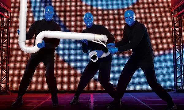 Blue Man Group is a group of three bald performers, decked out in all black with the exception of their heads and hands – which are blue.