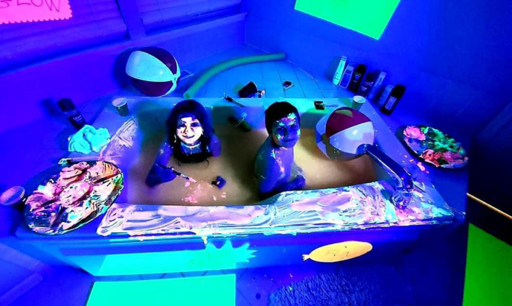 A fast and easy way is to drop several glow sticks into the tub. You could also place a black light on the opposite side of the bathroom to safely get a vibrant, neon glow. For extra fun, use non-toxic neon paint mixed with shaving cream and let the kids decorate the bathtub full of bright colorsÂ