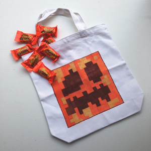 I‘ll bet you probably know at least one person among your family and friends who’s a fan of Minecraft. I definitely do! My friends love to show off their fascination with the block-building video game with personalized accessories for home and the office. When thinking about fun things to make for Halloween, I thought of the Minecraft pumpkin. When you look at it for a while, its grid-like face translates easily into a color-by-number-like design. This week, we’ll turn a plain tote into a treat-ready bag with our pumpkin color block grid.