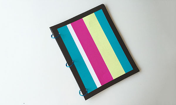 Once your stripes are all set, it’s time to add the black duct tape to the cover to create a border. Once again cutting off a piece of tape that’s longer than each side of the paper, add the black tape to each side, folding over in half to seal onto the back. Trim the excess tape. Repeat the exact same process with your other piece of cardstock so that you have a front and back cover for your notebook.