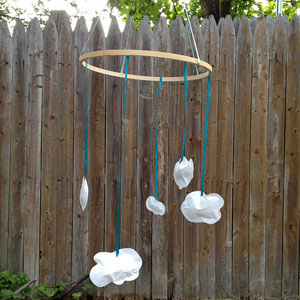 Every now and then, I like to see if there’s a silly holiday to celebrate. You know the variety: National Cookie Appreciation Day, Talk Like a Pirate Day (arr!), etc. Today is one of them – it’s Ride the Wind Day! Who knew? Why not celebrate this breezy holiday by making a cloud mobile out of a kitchen staple: Freezer paper. If you made our freezer paper stencil T-shirts from the spring, I bet you’ve got a roll on hand right now …