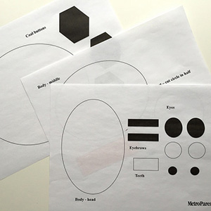 2. Cut out all of the pieces and stack together by sections: body, face, etc.