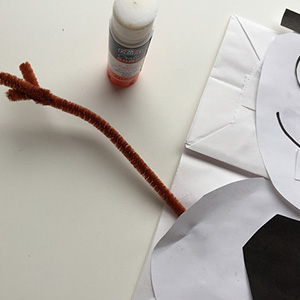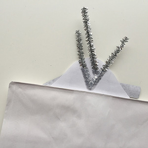 11. The paper bag puppet is almost ready! Cut three small pieces from a silver pipe cleaner. Turn the bag over and tape the pieces into place toward the top of the head.