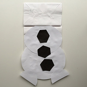 3. Build the body of the snowman by gluing the largest circle onto the bag first. Then add the middle circle – but don’t glue the sides of the circle just yet. Add the two feet to the bottom. Finish this section by adding the three coal pieces down the front of the body.
