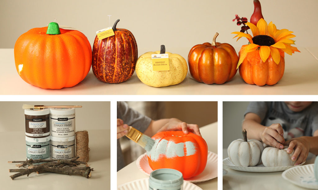 First, send the kids on a stick hunt in the yard – some thick, some thin – while you set up all the other supplies. Next, remove the stems and paint the pumpkins with two coats of paint and let dry. (Good news: Chalk paint dries quickly).