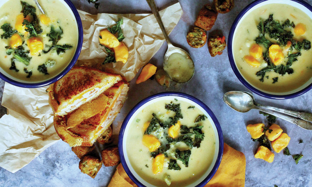 4. Serve immediately and top with crispy kale chips and cheddar cheese curds alongside your favorite grilled cheese sandwich.