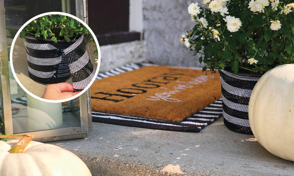 Amy also has a brilliant hack for mums in plastic pots. “Wrap the base of the pot in a weather-friendly fabric and hot glue the seam in the back. I used black and white striped wide mesh ribbon and trimmed it to fit – I love how it ties in the front door mat. You can even use burlap garland or wrap the pot in rope.”