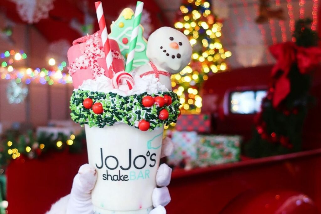 Anyone worth their sweet tooth knows that JoJo’s is the go-to spot for an over-the-top dessert any time of year. The next time you’re in the mood for a milkshake, get into the holiday spirit with JoJo’s Winter Wonderland Biggie shake. The supersized milkshake is topped with red and green sprinkles, a sugar cookie and a snowman made out of doughnut holes!Â