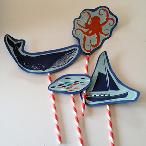 | 1. Start out by doing a rough cut around the shapes or pictures on your wrapping paper. On my piece, I liked the octopus, whale, school of fish and ship. |